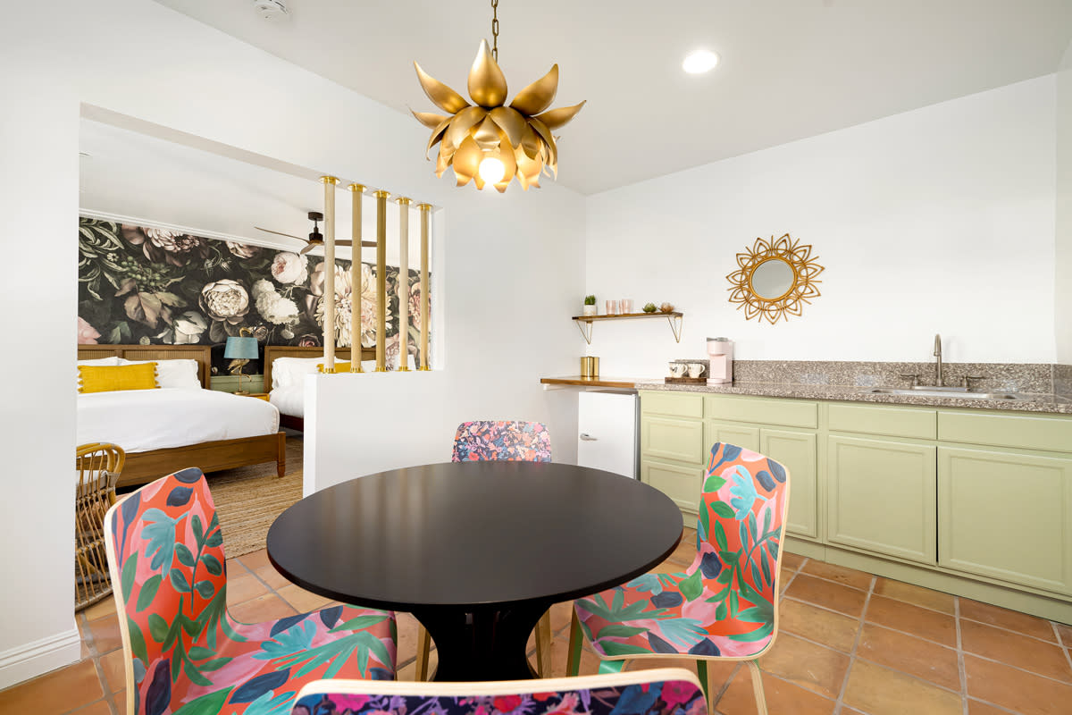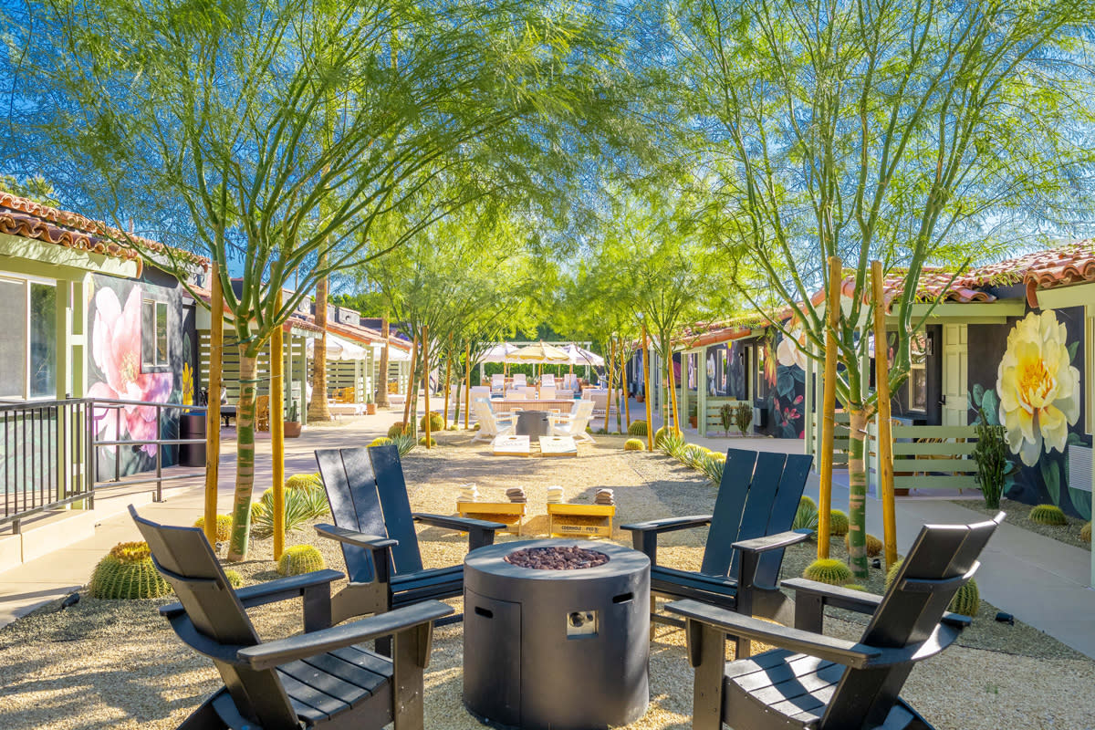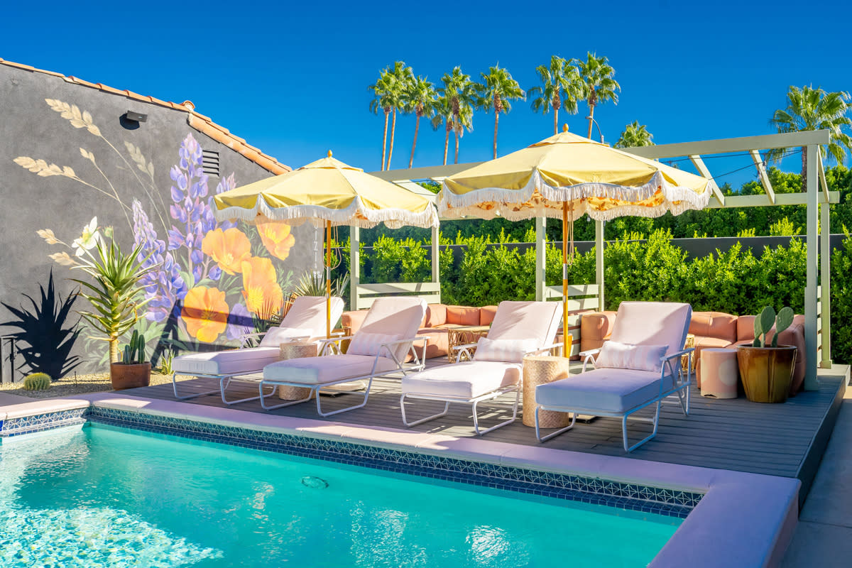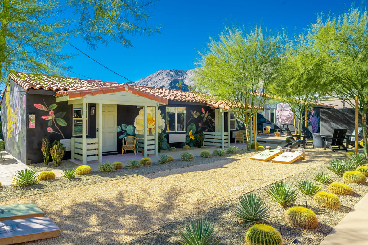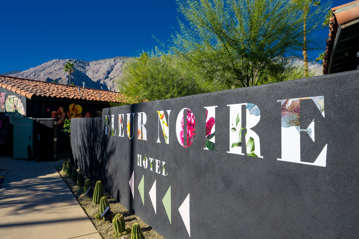 Fleur Noire is now in bloom. This new boutique hotel’s 21 Spanish-style casitas, studios, and standard rooms each have their own distinct look, courtesy of interior designer Chris Pardo and wallpaper designer Ellie Cashman. Before guests even get to their rooms, they are dazzled by the stunning outdoor murals of desert flowers created by artist Ouize and greeted by staff with a welcome drink. Each of Fleur Noire’s rooms features Cashman’s beautifully bold floral wallpaper, as well as updated dining areas, furnishings inspired by the mid-century modern era, pink Keurig coffee makers, and refrigerators that are stocked daily with complimentary water. Most accommodations also come with a wet bar area that has a sink and all the glassware needed for an in-room shindig. The heated pool is original to the property, which first opened in the 1940s as Burket’s Trade Winds Hotel, and is the centerpiece of the hotel. The grounds are covered with native desert plants and shaded by palo fierro trees, and guests are invited to linger around the fire pits. For those looking for some additional space, Fleur Noire has a clubhouse that is open daily from 7 a.m. to 10 p.m., with a communal pantry, lounge seating, and working and dining areas. In the mood for some bubbly? Take note: opening this spring is La Boisson, Fleur Noire’s speakeasy champagne and rosé bar offering dozens of different varieties of rosé, plus other intoxicating libations. There’s no need to get up either — just send a text and your favorite drink can be served to you poolside.