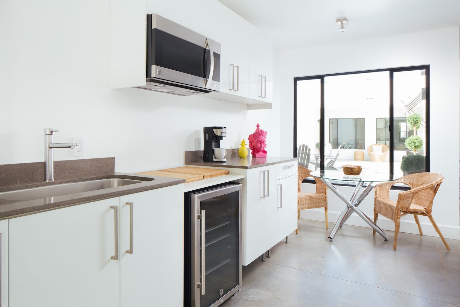 Everything about El Cid Palm Springs is stunning, but there’s something truly special about its pool area. “It really is dramatic with the black and white cabanas, loungers, and sofas,” owner Tim Spry says. “At night, with just the chandeliers on in the cabanas and the landscape lighting, with that killer view of the mountains, it’s kind of magical.” El Cid opened in the fall of 2016, after several months of construction. It’s different from a typical hotel — El Cid can only be rented by one group at a time, giving guests the opportunity to really make themselves at home. There are seven bedrooms and bathrooms spread across six bungalow-style units, with most offering kitchenettes. The property had “good bones,” Tim says, and while upgrades were made, he found the existing design meshed well with his vision for El Cid. “The former owner loved concrete floors and had kept to a simple, bright white color palette,” Tim says. “We furnished the whole place, added three cabanas by the pool, and a dining cabana on a grassy area nearby. We love black and white striped fabric, so we added awnings in the same style as the cabanas.” The well-being of everyone who stays at El Cid is of the utmost importance, and the property has strict cleaning protocols. “The safety of our guests and staff is paramount,” Tim says.