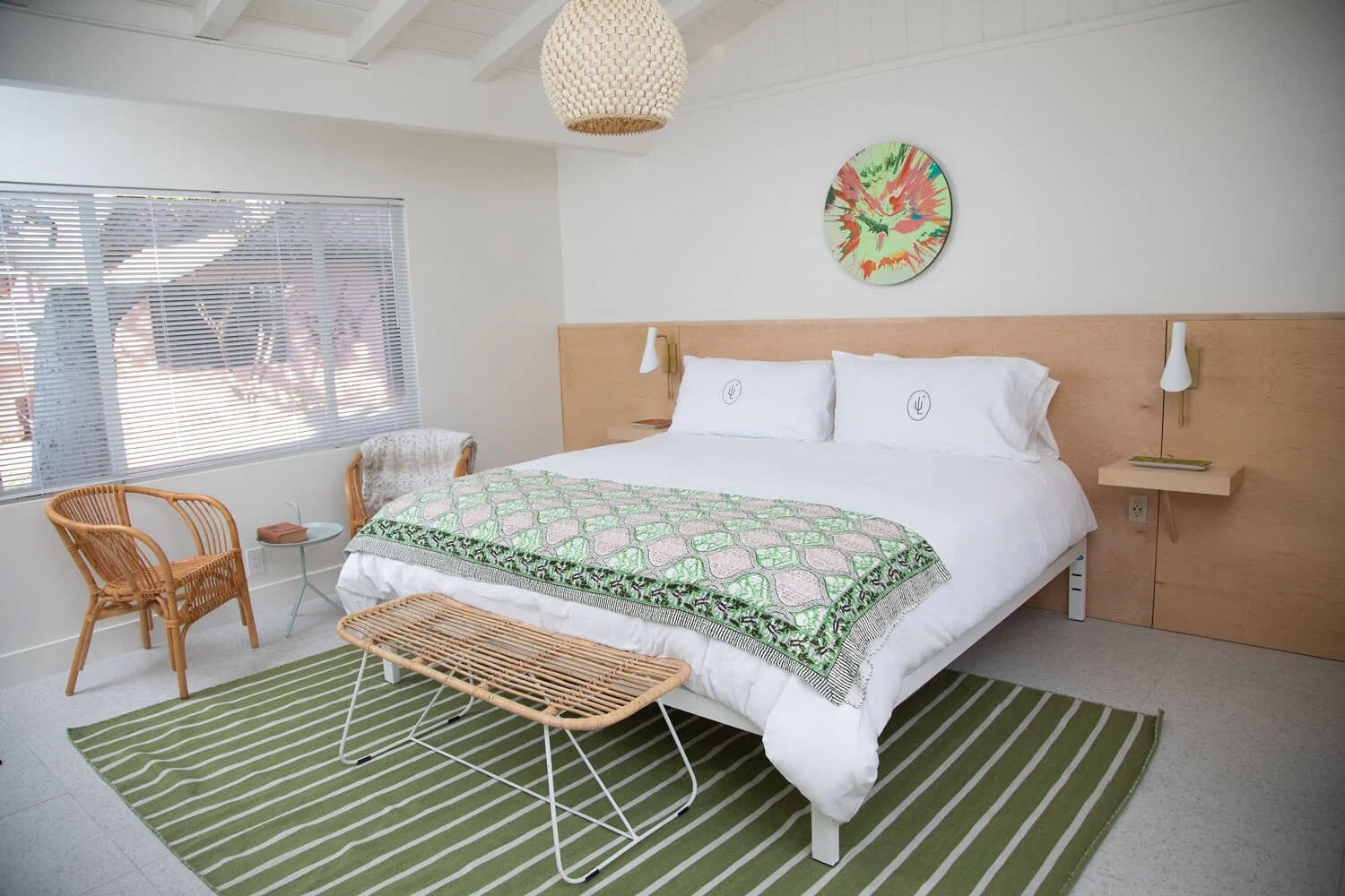 Les Cactus Palm Springs, named after the ’60s French rock ‘n’ roll hit by Jacques Dutronc, brings to life an “Airbnb-meets-hotel’ experience to the desert. The historic 1930’s property has been refreshed under the direction of up-and-coming L.A.-based hotelier Matthew Kurtz in partnership with local Palm Springs hoteliers Richard Crisman and Jeff Brock. Together they deliver a whimsical boutique hotel with minimalistic yet chic design and approachable service – all at an affordable price point. The pet-friendly hotel boasts a clean and eclectic California design aesthetic, featuring 27 guestrooms that include a mix of one-bedroom suites and studios. Hotel amenities include a heated pool, hot tub, and massage room as well as a hammock garden and rooftop deck along with other communal living areas, which provide guests with a residential feel.