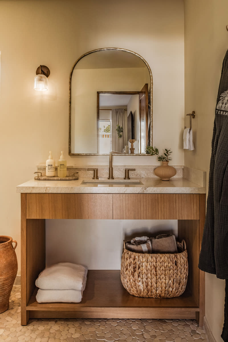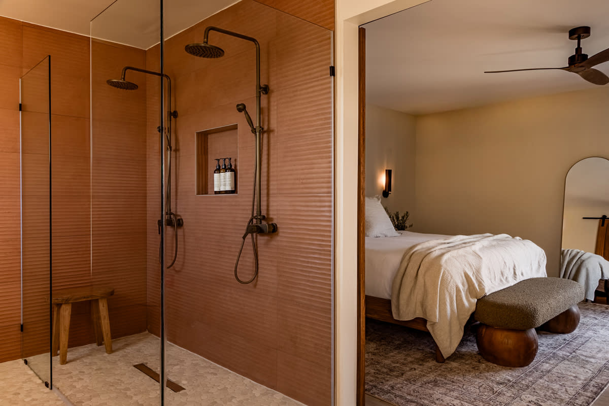 With its Himalayan salt sauna, immersive rain room, and cold plunge, Terra Palm Springs is dedicated to giving guests the ultimate wellness experience. Owners Soli Cayetano, Josh Dobken, Diana Ossa, and Carrick Young created a destination where “people who feel stressed or burned out can come and discover a place to relax and try new healing modalities,” Soli said. “We went on a journey of trying to figure out how to fit as much wellness into the property as possible.” In addition to the sauna, rain room, and cold plunge — all complimentary amenities for guests to use during their stay, any time they please — Terra Palm Springs also boasts a spa offering centering Ayurveda treatments like the Dry Herbal Powder Lymphatic Detox and Choorna Pinda Poultice Massage. “Wellness in general is a growing industry — it’s no longer a luxury but something people aspire to do every day and incorporate into their lives,” Soli said. She finds that the Terra’s rain room is a “deeply meditative experience, it’s basically a thunderstorm in a room,” while the Himalayan salt sauna provides purification. “There is something about being in there with warm salt blocks, it just feels different,” Soli said. “A lot of negative ions are released from salt blocks, and the experience is very meditative.” The partners purchased the Terra Palm Springs property, formerly the Bearfoot Inn, in June 2024. They all fell in love with the “stunningly beautiful” landscape of Palm Springs and its “amazing energy,” and the hotel’s prime location near restaurants and shops. “The views are also phenomenal,” Soli said. “To walk in and see the mountains in front of you is pretty amazing.” The 13 rooms tie in with the name Terra, which “points to the Earth and is very grounding,” Diana, the designer and architect of the project, said. “It’s even in the color scheme we’ve chosen. A lot of the rooms attempt to bring the outdoors inside, with pebble stone in the bathrooms and our vanities custom made out of travertine. All of our finishes are really textural and tactile.” Wellness amenities are included in the rooms and suites, and there are also add-ons available like red light therapy masks and electromagnetic mats for sleeping and meditating. Each space also has its own special feature: the Movement Room boasts a private fitness patio while the Deluxe Spa includes a 72-inch indoor soaking tub. Guests looking to relax outside can take advantage of the heated pool and hot tub and order from the full bar serving health-inspired wine, mocktails, and cocktails like the Terrarita, made with marine collagen, avocado, and tequila. “We cater toward a lot of people who are sober curious, and we have a lot of options that are both alcoholic and nonalcoholic in the room mini-bars,” Soli said. Guests will also find other goodies, like kombucha, probiotic drinks, shower steamers, non-psychedelic mushroom gummies, body scrubs, and face masks. For Soli, the goal is for every guest to enjoy their time at Terra Palm Springs and go home feeling refreshed, renewed, and excited to return. “We want Terra to be a place where you can come over and over again to try the different unique rooms with different amenities,” she said. “Try the indoor soaking tub now and next time the private cold plunge or private firepit.”